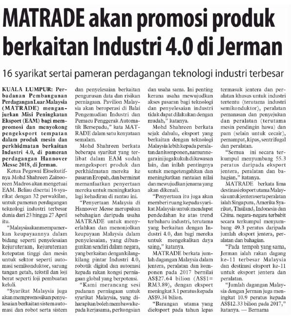 MATRADE akan Promosi Produk Berkaitan Industri 4.0 di Jerman