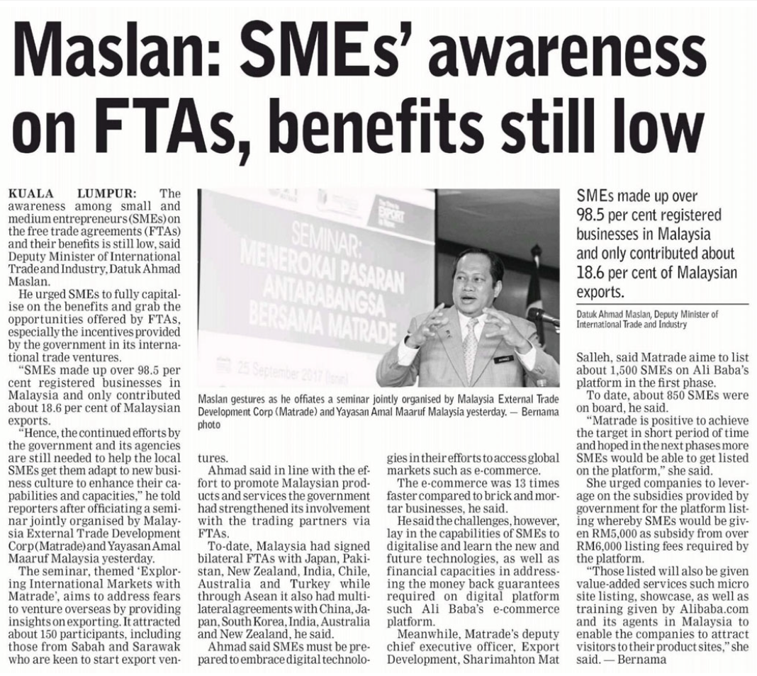 SMEs Awareness On FTAs Benefits Still Low - Ahmad Maslan