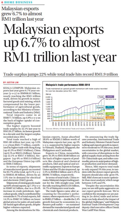 Malaysian Exports up 6.7percent to Almost RM1 Trillion Last Year